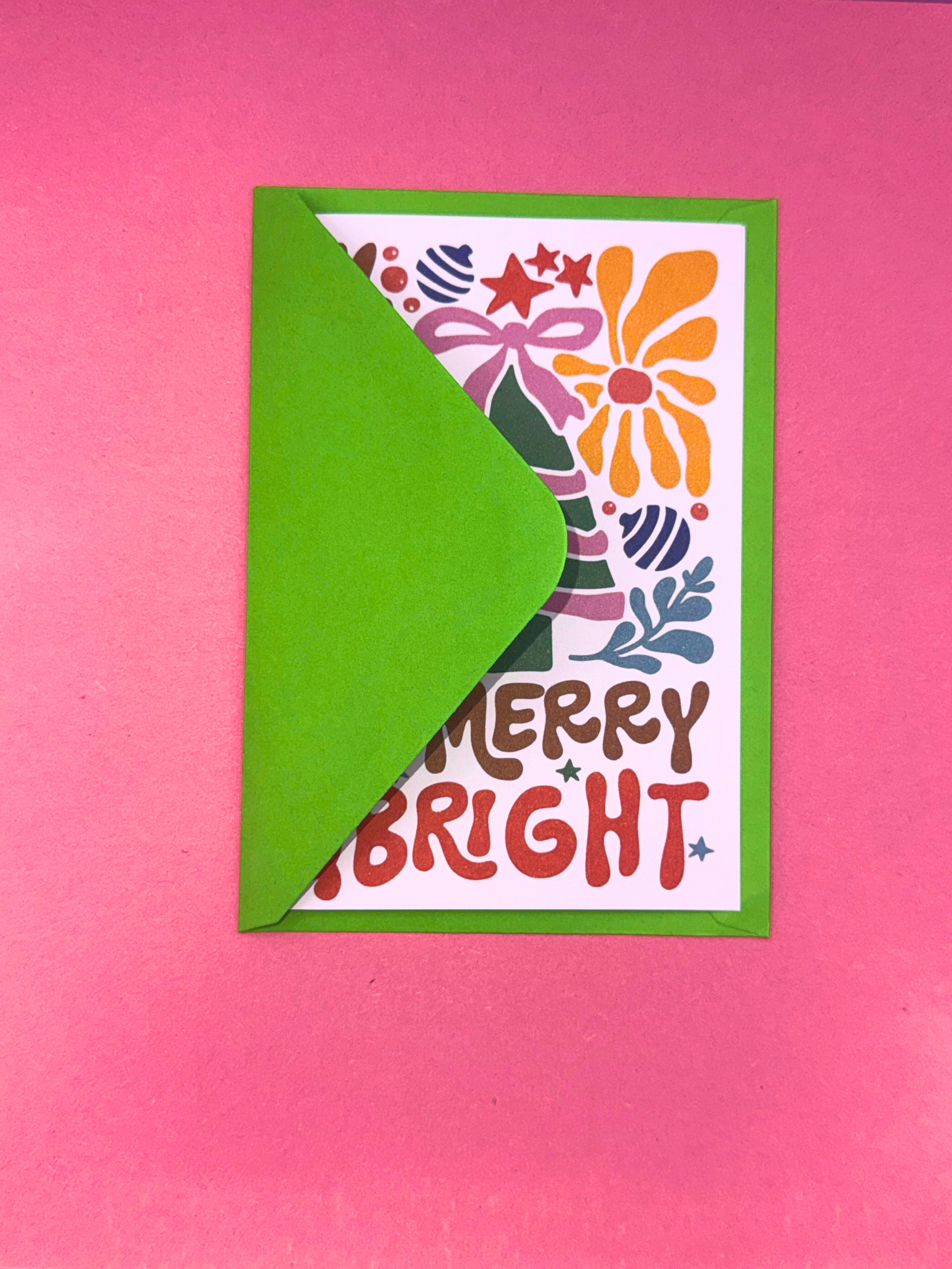 Spread festive cheer with this vibrant Christmas card featuring "Merry and Bright" in a contemporary abstract design. Bold, eye-catching patterns and colours create a modern twist on traditional holiday greetings, perfect for those who love artistic flair. Whether you're sending wishes to friends, family, or colleagues, this card brings personality and warmth to your seasonal messages. Blank inside for your own heartfelt words.