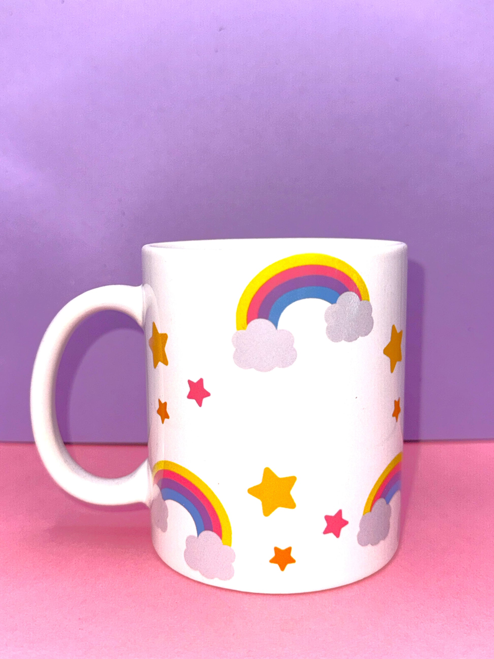 Experience a splash of color and wonder with our Rainbow and Stars Mug. This unique mug features a vibrant rainbow and sparkling stars design, adding joy to your everyday coffee or tea routine. With its sturdy ceramic construction, this mug is both eye-catching and functional.